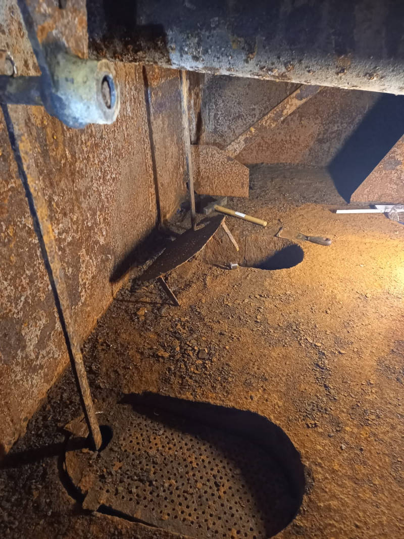Auch am Tender für die Dampflok 50 3570 ging der unerbittliche Kampf gegen den Rost und Kalkablagerungen weiter. Heute wurde die Innenseite des Tenders von grobem Kalk befreit und die Verschlüsse der Ablaufventile gangbar gemacht. Mit ihnen kann der Wasserzulauf vom Wasserkasten des Tenders zur Lok unterbrochen werden, wenn es eine Störung an den Pumpen der Lok oder Wartungsarbeiten gibt. Die Arbeiten sind ziemlich mühsam, weil sich die Kollegen vom hintersten Ende des Tenders bis zur anderen Seite, die zur Lok zeigt, vorarbeiten müssen. Dabei mussten sie sich durch einige Aussparungen in den sogenannten Schwallblechen zwängen. Die Schwallbleche verhindern, dass das Wasser während der Fahrt ungebremst durch Tender schwappt. Die Arbeiten sind sehr unangenehm, da der Platz sehr begrenzt ist, es dunkel ist und die Geräusche stark hallen. Keine Arbeit für Menschen mit Platzangst.