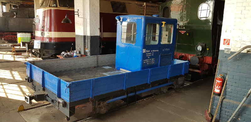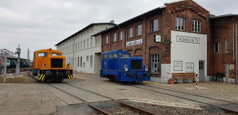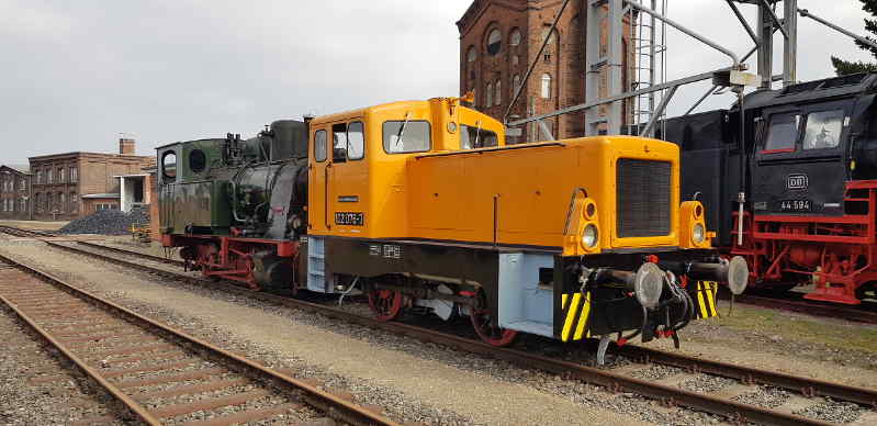 Die Diesellok 102 076 hatte nach Fertigstellung ihrer neuen Lackierung zum ersten Mal Auslauf und präsentierte sich zunächst mit ihrer blauen Schwerster vor der Lokleitung, die als Werklok der Wittenberger Ölmühle beschriftet ist.