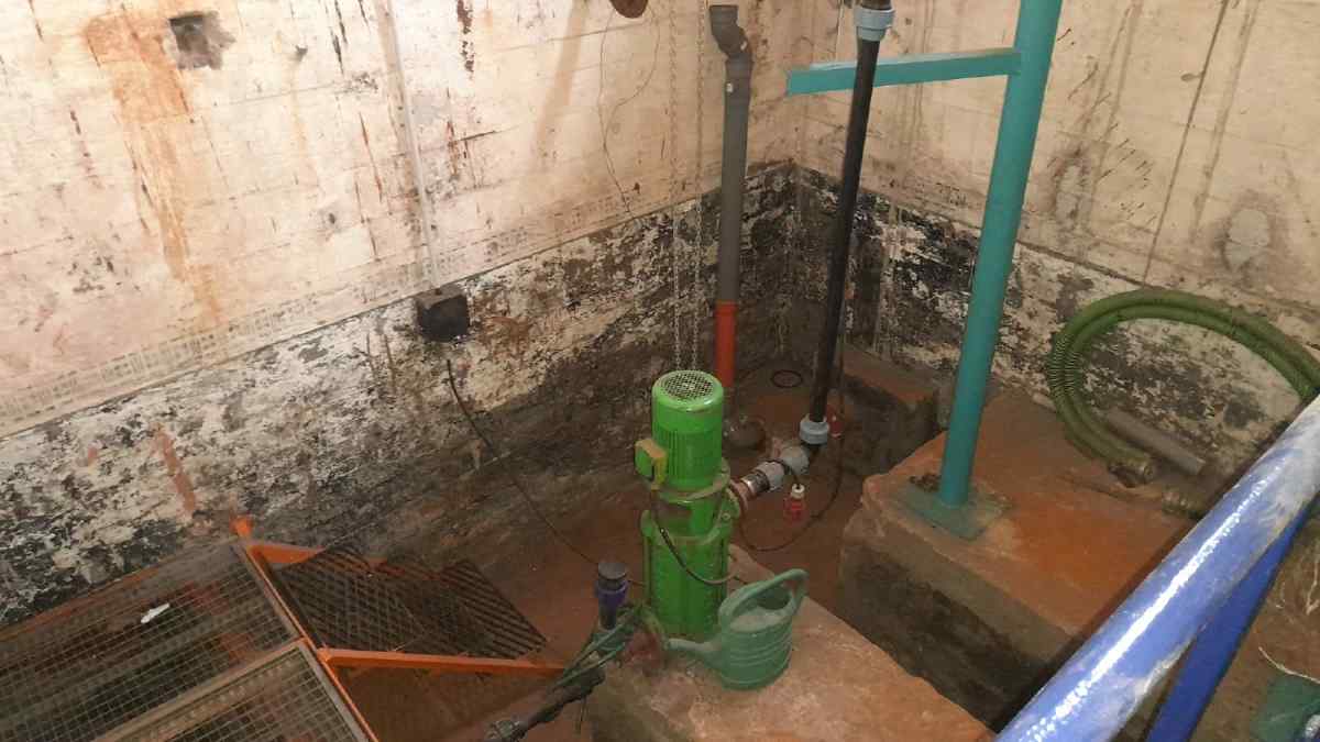 Wir erkennen einen rund vier Meter tiefen Schacht, der eine Grundfläche von vier mal vier Metern hat. Wir haben eine neue Treppe erstellt, die Saugleitung aus dem Brunnenschacht wiederhergestellt und eine elektrische Pumpe eingebaut.