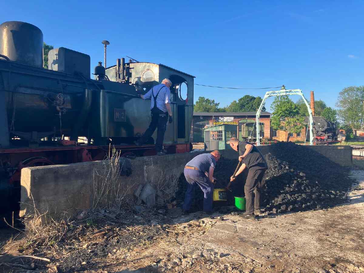 In Luckau angekommen haben wir die Lok wieder komplettiert, nachdem einige überhängende Teile für den Transport abgeschraubt worden waren.