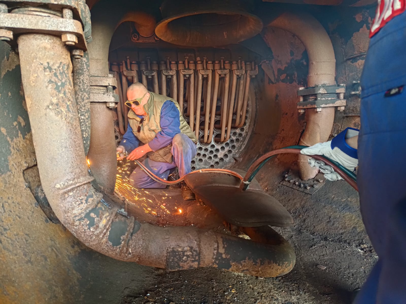 Nebenbei werden weitere Anbauteile des Kessels aufgearbeitet, hier säubert der Kollegen noch ein paar Waschluken.