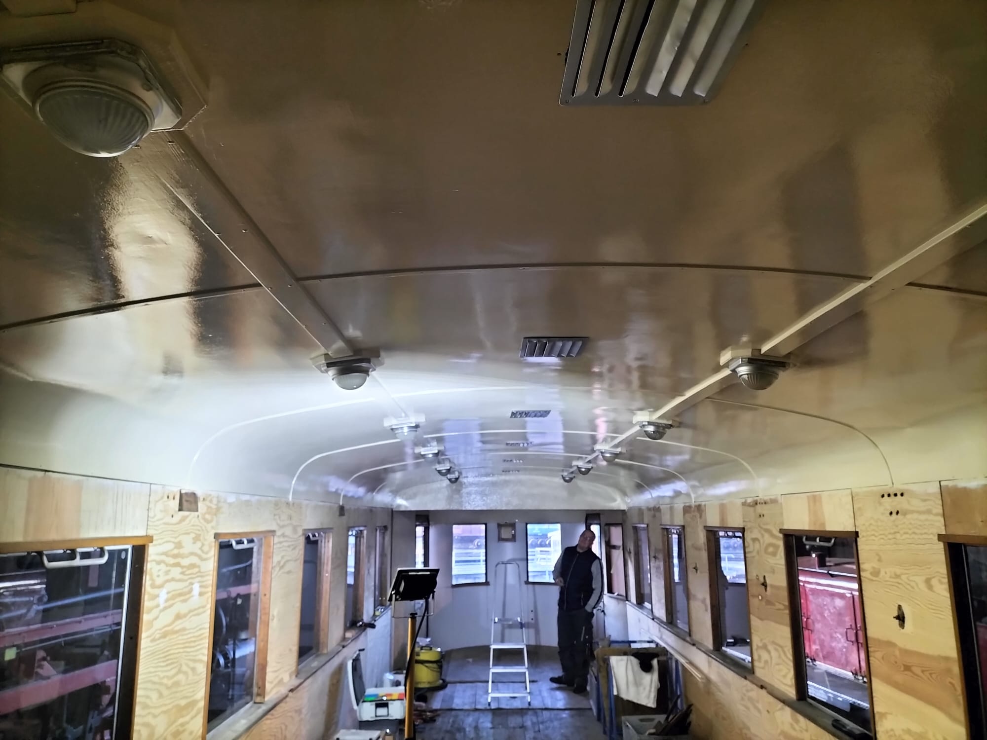 Weitere Fortschritte macht auch der Wagen 197 805. Dort haben die fleißigen Kollegen die Deckenbeleuchtung neu verkabelt und die Lampen eingebaut. Auch die Lüftungsgitter sind wieder an ihrer gewohnten Stelle.