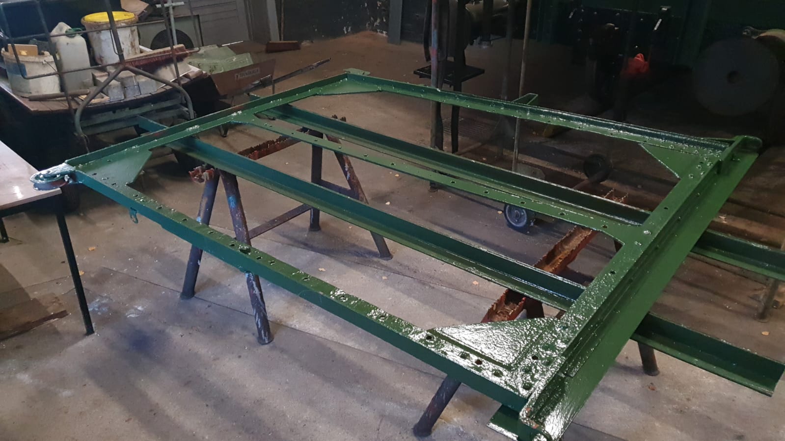 In die Endphase der Komplettierung kommt nun auch unser Güterwagen der Bauart G10. In mühevoller Kleinarbeit haben die Kollegen ihn gründlich saniert. So wurden die Achsen und die Federung ausgebaut und überholt und die meisten Holzteile neu angefertigt. Als letztes wurde der metallene Rahmen der zweiten Seitentür gerichtet und neu lackiert, damit jetzt die Holzfüllung eingebaut werden kann. Wenn die Tür eingebaut und die Beschriftung des Wagens angebracht ist, ist der Wagen ausstellungsreif fertiggestellt.