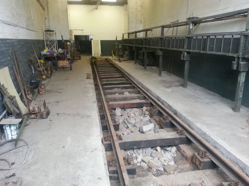 Auch die Gleisbaustelle im Lokschuppen macht Fortschritte: Inzwischen wurden Schwellen und Schienen verlegt. Nun fehlt im Wesentlichen noch die Betonabdeckung des Zwischenraums zwischen den Schienen bzw. am Rand zwischen den Schienen und dem bereits vorhandenen Fußboden.