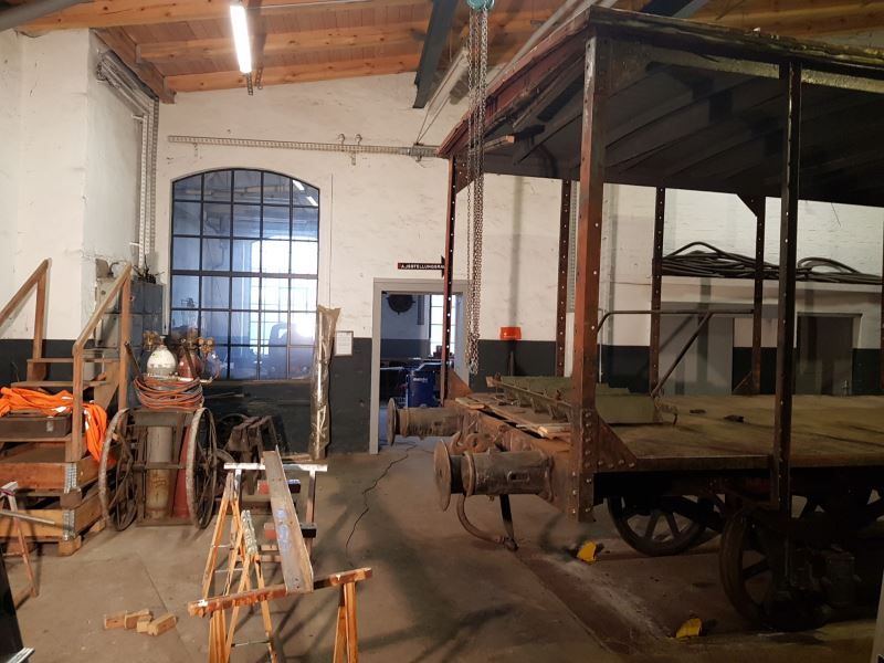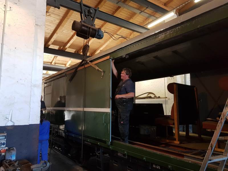 Ein historischer Güterwagen befindet sich gerade in der Aufarbeitung. Der zweiachsige Wagen hat Seitenwände aus Stahlfachwerk, das mit Holzlatten verkleidet ist. Der Aufbau hatte über die vergangenen Jahrzehnte sehr gelitten und wird deshalb jetzt von Grund auf saniert. Dazu werden die Stahlteile entrostet, neu lackiert und wo nötig ersetzt. Anschließend werden neue Holzverkleidungen angebracht.