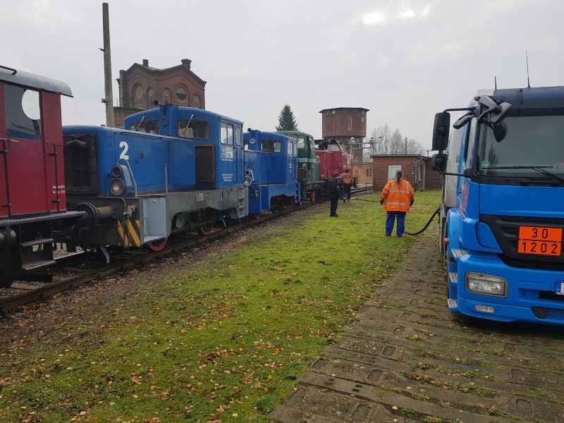 Nachdem die Saison Ende Oktober erfolgreich beendet wurde, sind die Aktiven des Museums mit Herbstarbeiten beschäftigt. Dazu gehört zum Beispiel, dass unsere Dieselloks konserviert abgestellt werden. Eine Maßnahme der Konservierung besteht darin, die Tanks mit Diesel zu füllen, damit sich über Winter kein Kondenswasser bildet und die Tanks von innen rosten. Da wir dafür recht viel Treibstoff brauchen, haben wir gleich mal einen Tankwagen bestellt.