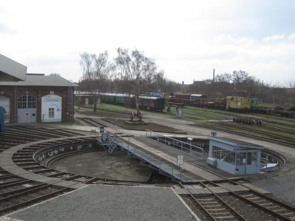 Die Drehscheibe ist das Herzstück des Museumsgeländes. Sie dient dazu, ankommende Lokomotiven zu drehen und somit auf die angrenzenden Lokschuppengleise zu verteilen. Die Anlage hat eine Tragfähigkeit von 350 Tonnen. Sie wird wahlweise elektrisch, per Druckluft oder per Muskelkraft angetrieben. Die Drehbrücke ist knapp 24 Meter lang und damit die größte in Deutschland noch existierende Anlage dieser Art.