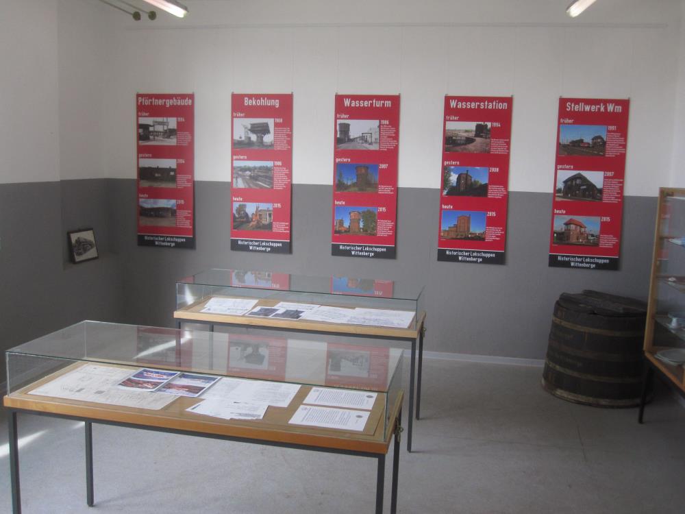 Hier ein Blick in den Ausstellungsraum des Museums. Hier haben die Aktiven einige Kleinteile aus dem Betriebsalltag in Vitrinen zusammengetragen. An den Wänden erkennt man außerdem einige Fototafeln, auf denen die Zustände markanter Gebäude und Einrichtungen zu Betriebszeiten, zu Zeiten des Stillstands in den 2000er Jahren und nach der Renovierung zeigen. Eine interessante Zeitreise.