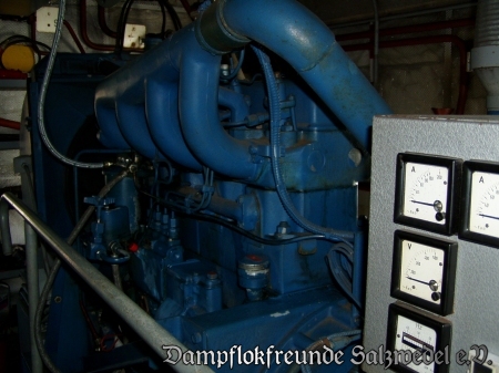 Der Maschinenwagen bietet zunächst eine Kabine für die bereits oben erwähnten vier Mann Besatzung des Zuges, die hier auch schlafen konnten. Daneben befindet sich ein kleiner Raum, in dem der Maschinenleitstand und eine kleine Werkstatt kombiniert sind. Hinter einer schallisolierten Tür befindet sich das Herzstück des Wagen, der Generatorraum. Hier sind zwei 4-Zylinder-Dieselaggregate aufgestellt, die den gesamten Zug und die dazugehörige Zeltstadt mühelos mit Strom versorgen konnten. Alle Einrichtungen des Wagen wie des gesamten Zuges sind nach wie vor funktionsfähig.