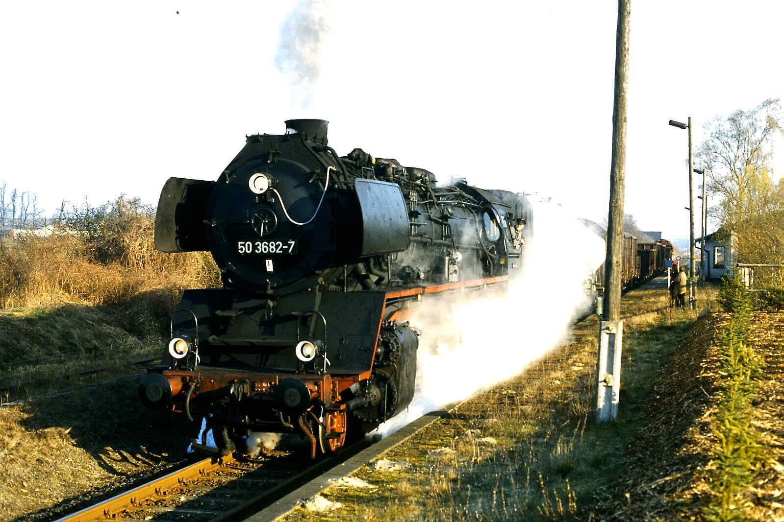 Ende der 1950er Jahre wurde unsere Lok im Ausbesserungswerk Stendal rekonstruiert und trug seitdem die Nummer 50 3682. Sie gehörte bis März 1993 zum Bestand der Deutschen Reichsbahn und wurde dann von einem Vereinskollegen erworben. Wir konnten sie bis 2019 betriebsfähig erhalten. Dann zwang uns allerdings der Zustand ihres Kessels dazu, sie abzustellen. Dessen Materialstärke ließ leider keinen weiteren sicheren Betrieb mehr zu.