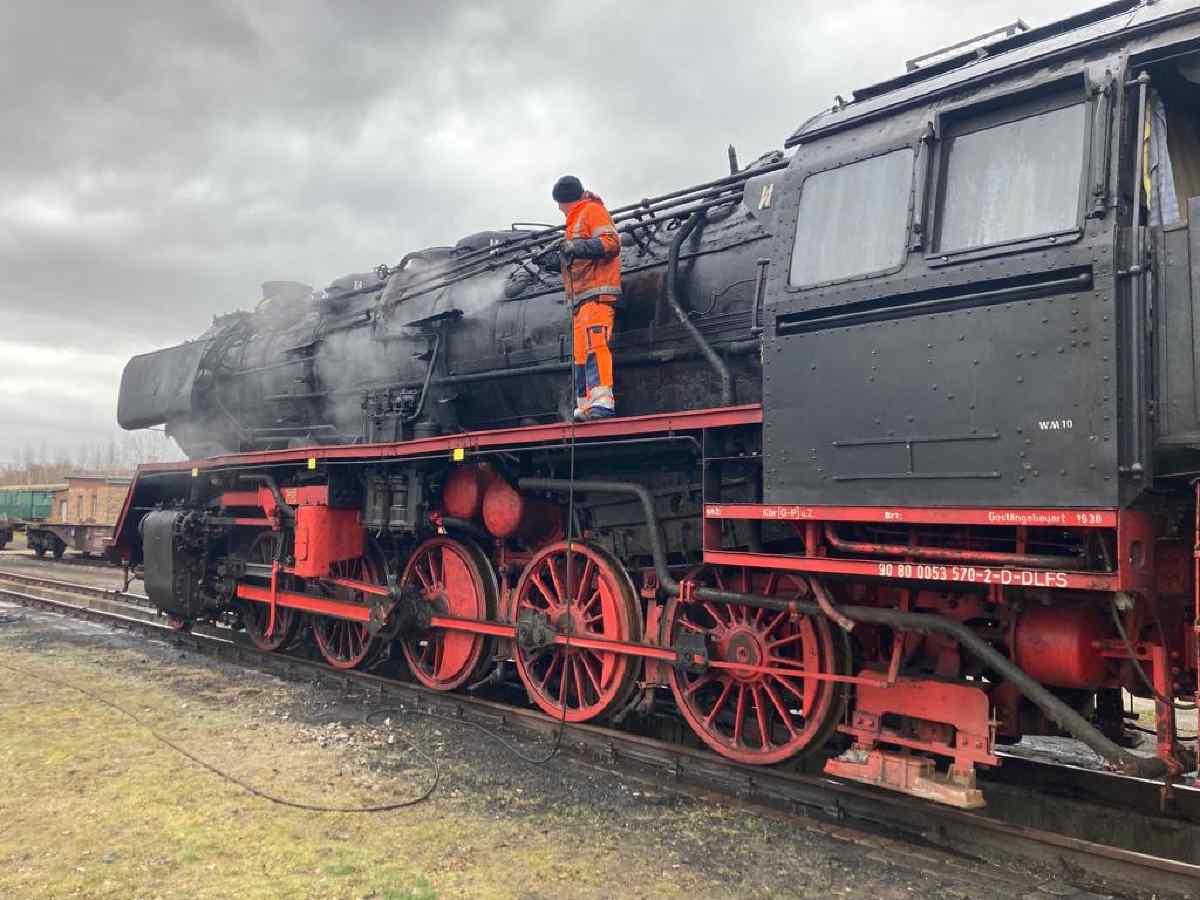 Am vergangenen Samstag haben unsere Dampfloks 50 3570 und 3682 etwas Frühlingsluft schnuppern dürfen. Wir haben sie nämlich auf das Gleis neben dem Lokschuppen rangiert, um sie mit einem Hochdruckreiniger zu säubern. Wegen der Größe der Lokomotiven hat das mehrere Kollegen mehrere Stunden lang beschäftigt.