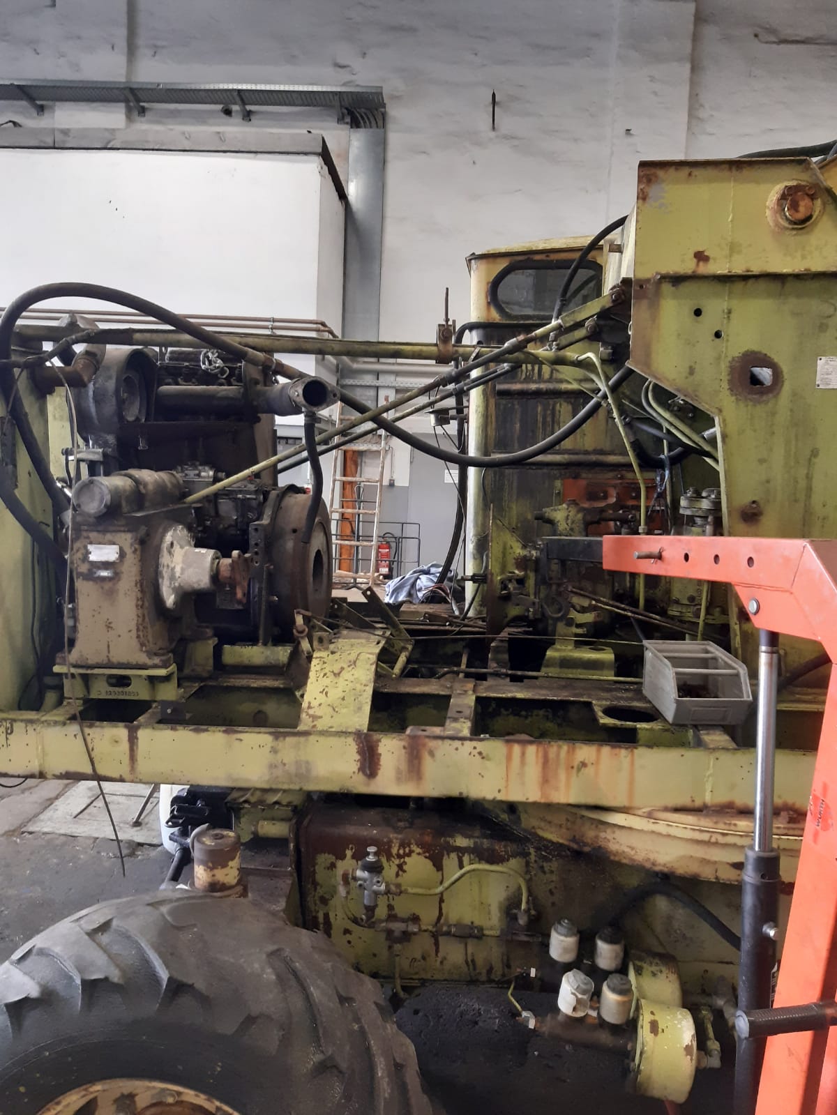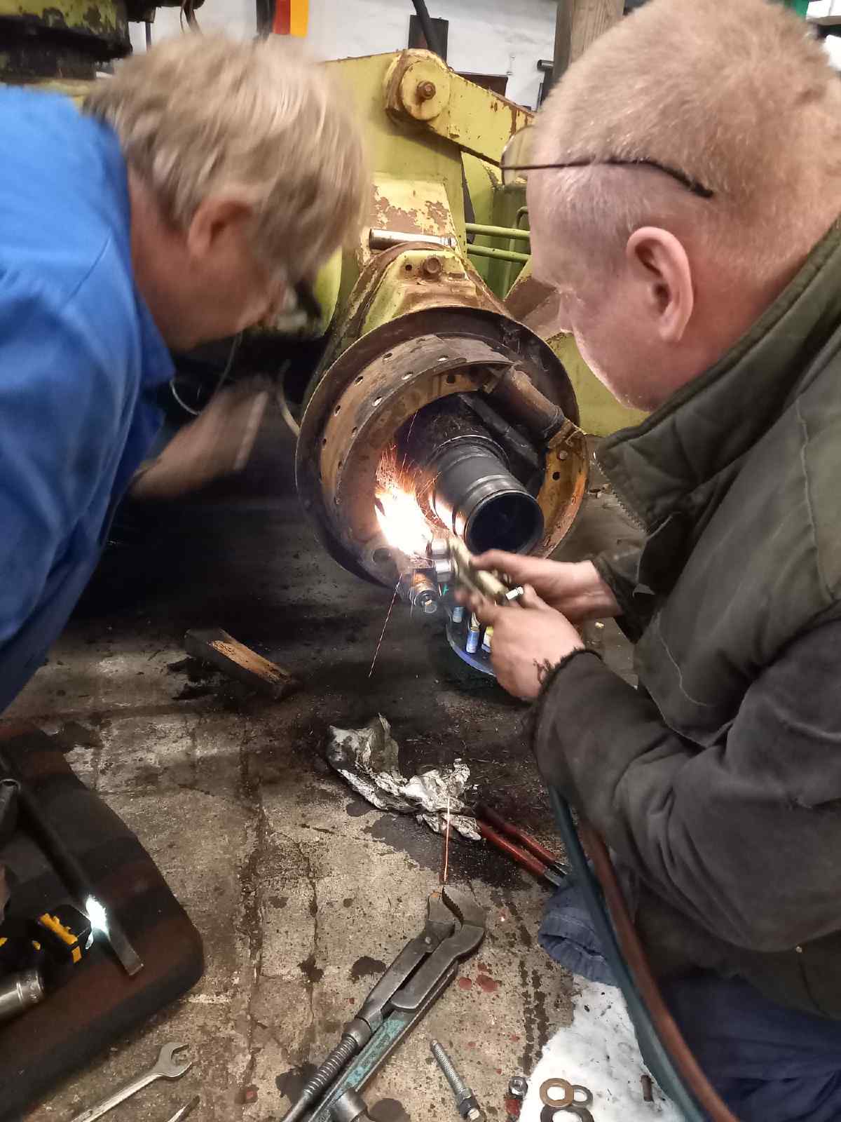 Fortschritte gibt es auch bei unserem Bagger. Hier konnte der Motorraum weitgehend ausgeräumt werden. Motor, Luftverdichter, Getriebe und Kupplung sind ausgebaut und werden von zwei versierten Kollegen instandgesetzt. Außerdem konnten heute zwei Radlager ausgebaut werden, die durch neue ersetzt werden müssen.