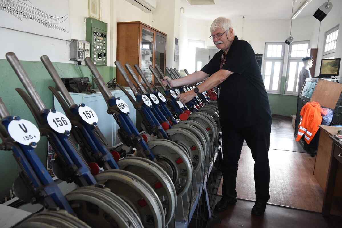 Die Führerstandsmitfahrten von Emma begannen und endeten jeweils neben unserem Museumsstellwerk WM, das auch zu besichtigen war. Viele Gäste schauten sich an, wie von hier aus die Weichen und Signale im Museumsgelände gestellt werden.