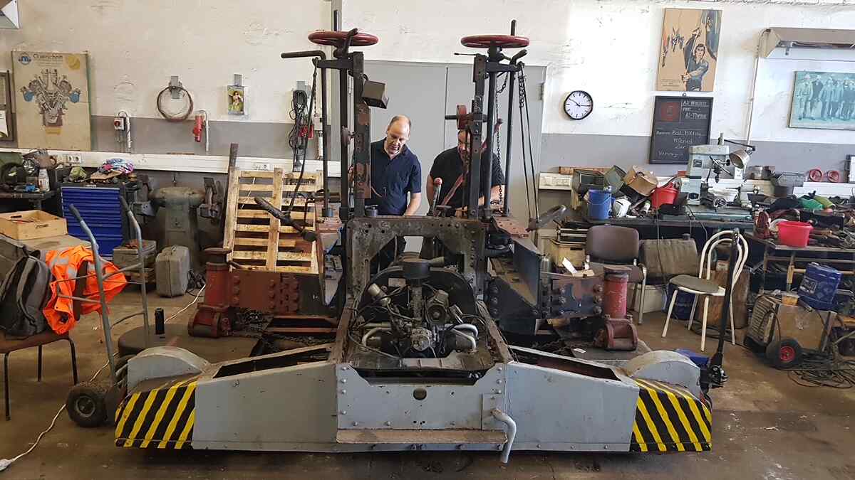 Auch unsere Werkstatt war in Betrieb. Neben der LGB-Eisenbahn war noch unser Rangiertraktor aus dem Hause Breuer zu bewundern. Um ihn war es einige Zeit still geworden, weil andere Arbeiten drängten. Am Wochenende wurde aber unter den Augen der interessierten Besucher der Motor, das Getriebe und die Kardanwelle eingebaut, so dass wir seinem ersten Einsatz zum Herbstdampf im Oktober 2024 entgegenfiebern.