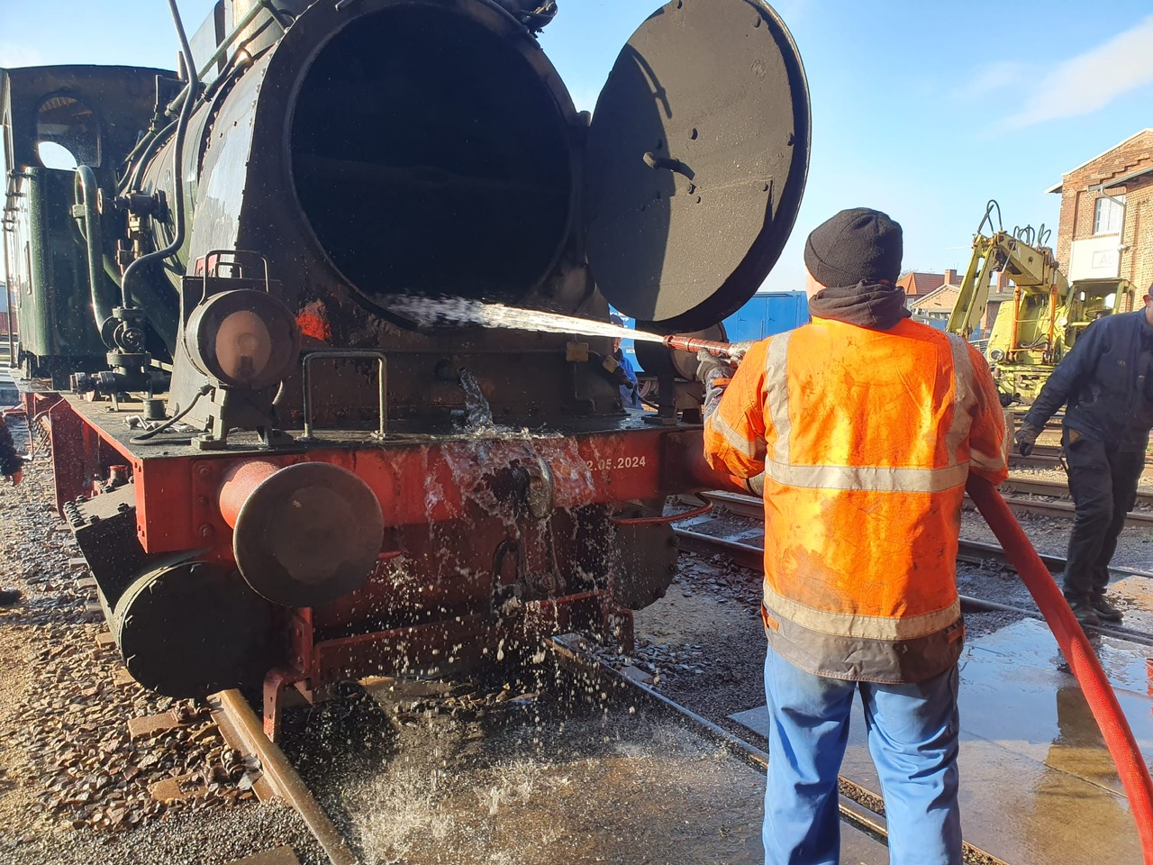 Nebenbei werden weitere Anbauteile des Kessels aufgearbeitet, hier säubert der Kollegen noch ein paar Waschluken.