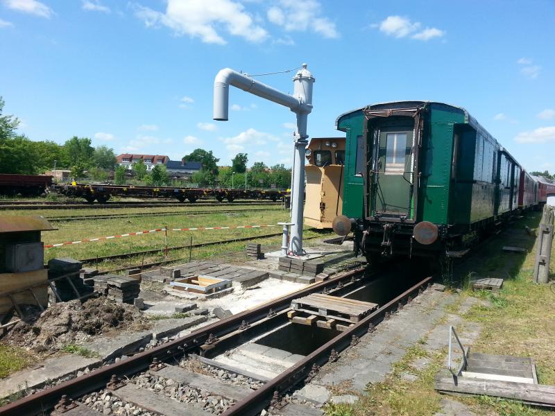 Ein emsiges Mitglied des Vereins hat sich dankenswerterweise des Fundamentes des letzten original erhaltenen Wasserkrans im Bahnbetriebswerk Wittenberge angenommen. Hier war der Ablauf für das Tropfwasser des Krans stark verkrautet und das Fundament durch Wurzelwerk angegriffen. Die Pflanzen wurden nun beseitigt und das Ablauf neu gemauert. Nun wird der umliegende Bodenbelag mit alten Materialien neu verlegt und verfugt.