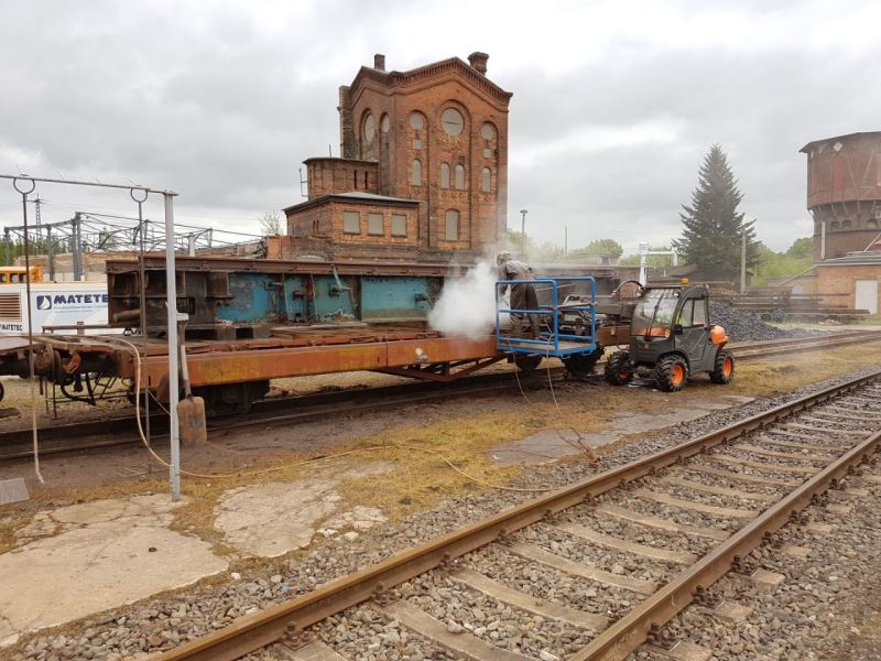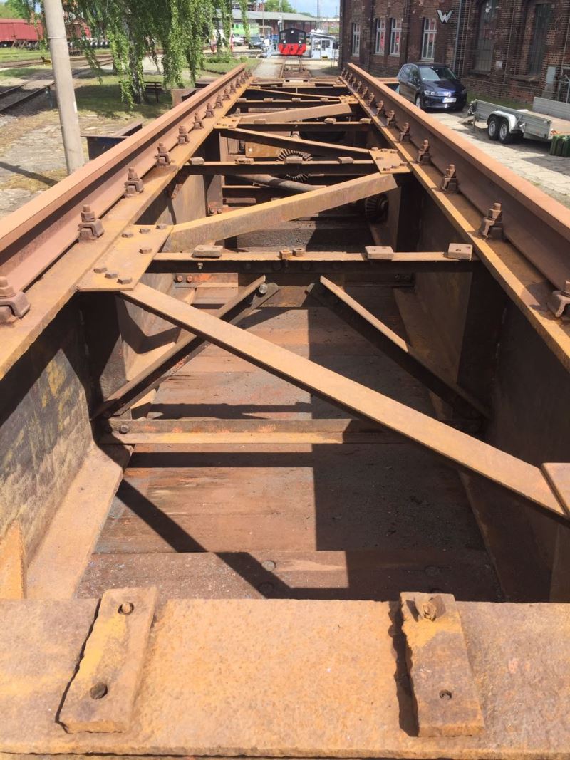 An anderer Stelle berichteten wir bereits darüber, dass die Drehscheibe im Bereich des ehemaligen Lokschuppens 1 Ende der 1990er Jahre verschrottet und die Drehscheibengrube verfüllt wurde. Da es es das langfristige Ziel des Vereins ist, diese Anlage wieder auferstehen zu lassen, wurden inzwischen erste Schritte für die Wiedererrichtung unternommen. So konnte aus Parchim eine Drehscheibenbrücke erworben werden, die in die wieder zu erschließende Drehscheibengrube des Lokschuppens 1 eingebaut werden kann. Sie hat die passende Länge. Nun wurden die Brückenteile von einer Fachfirma mittels Hochdruck-Wasserstrahl von alter Farbe und Rost befreit und anschließend grundiert. Nun können die Teile befundet werden. Wir erwarten dabei keine größeren Schwierigkeiten. Die Bilder zeigen die Reinigungsarbeiten am 23.5.2017.