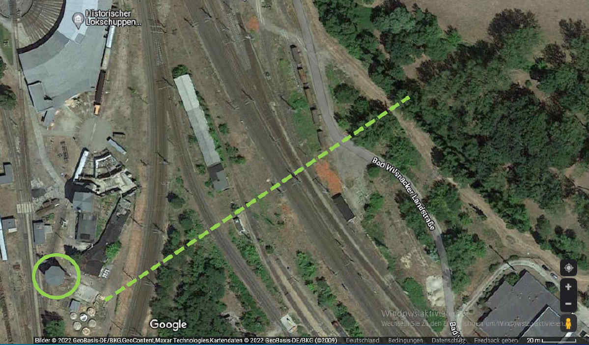 Vor einigen Wochen haben wir für Sie, liebe Leser, bereits einen Blick in unseren Wasserturm geworfen. Dort haben Sie den großen Vorratsbehälter gesehen, in dem das Wasser für unsere Dampflokomotiven aufbewahrt wird. Heute wollen wir Ihnen zeigen, woher dieses Wasser kommt. Dafür haben wir zwei "Quellen", die noch aus den Anfangszeiten des Bahnbetriebswerkes im späten 19. Jahrhundert stammen. Einerseits gibt es einen unterirdischen Zufluss von dem Flüsschen Stepenitz, das hinter den Bahngleisen auf der Berliner Seite verläuft. Ein unterirdischer Kanal führt von diesem Fluss bis auf das Lokschuppengelände. Er endet in der Nähe des Wasserturms in einem tiefen Schacht. Hier sind elektrische Pumpen angebracht, die das Wasser in den Turm fördern. Auf dem folgenden Bild erkennen Sie den Verlauf des Kanals, angedeutet durch eine gestrichelte Linie (Bildquelle: Google Earth).