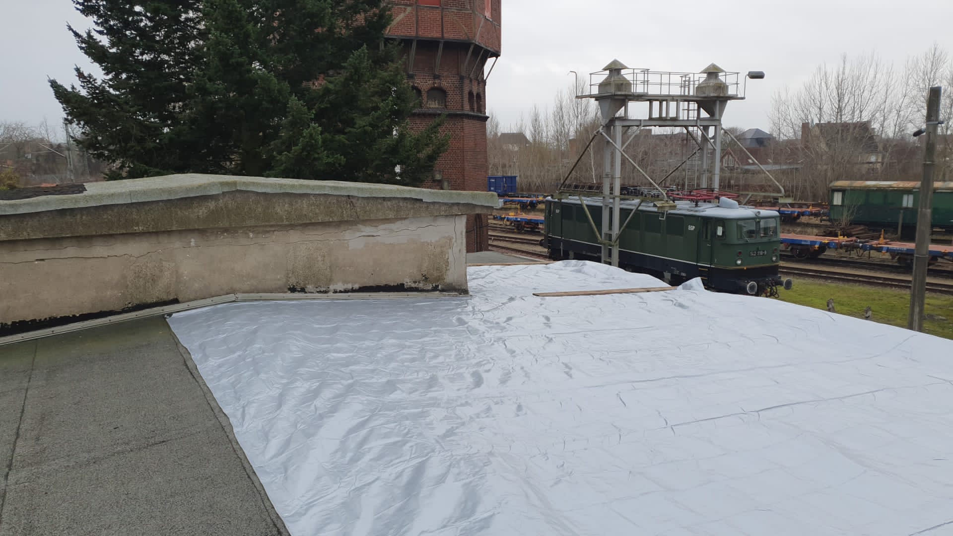 Leider muss man ab und zu mal einen unvorhergesehenen Einsatz einschieben, so auch am vergangenen Wochenende. So hatte sich bei den vergangenen Regentagen herausgestellt, dass das Dach der ehemaligen Halle für die Notstromerzeugung undicht geworden war. Hier wurde eine Plane angebracht, die provisorisch bis zum Frühjahr vor Ort bleiben soll, bis das Wetter das Aufbringen neuer Dachpappe zulässt.